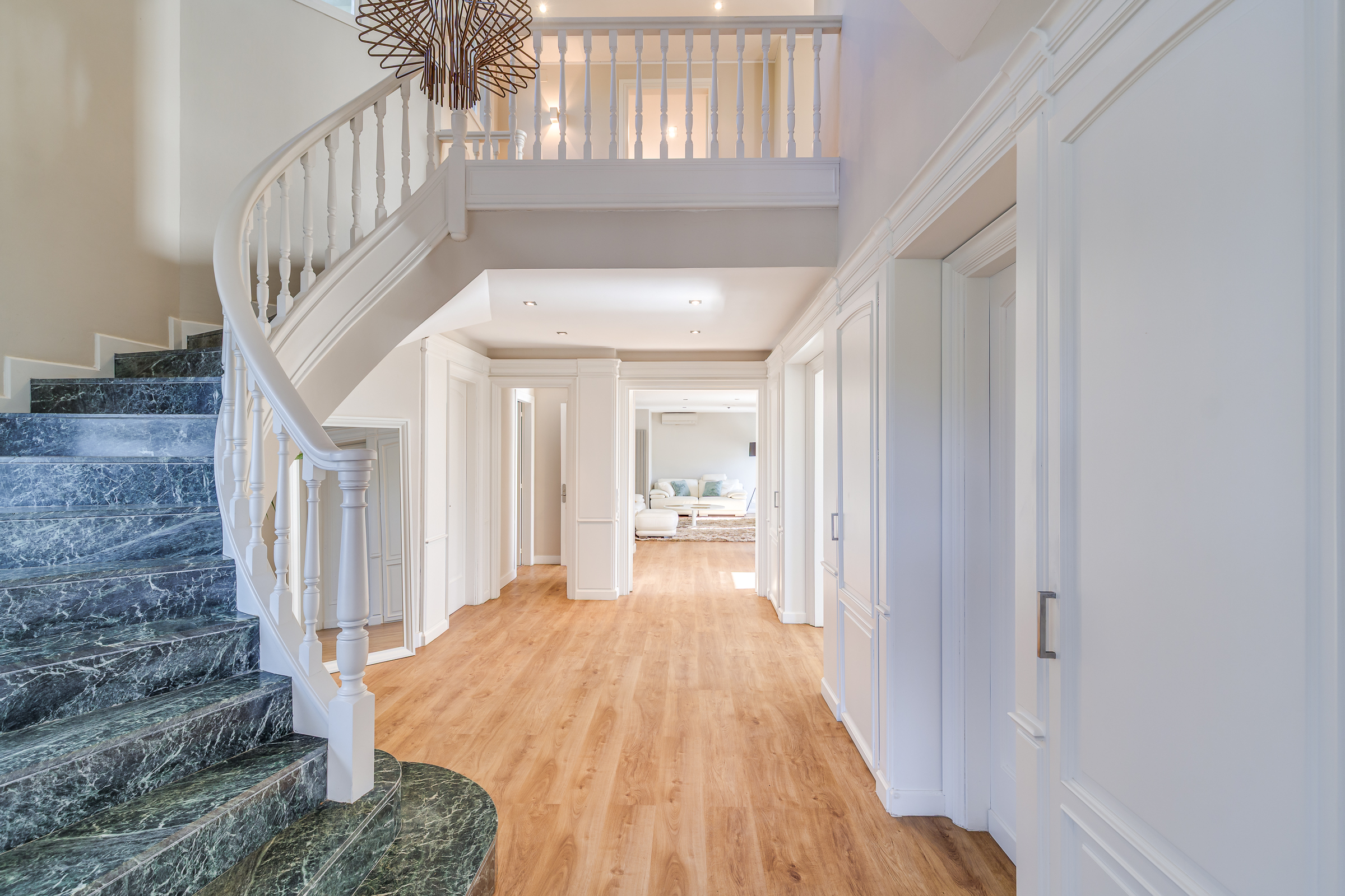 Al acceder, un majestuoso hall de doble altura —equipado con tres armarios de cortesía— nos da la bienvenida. Este da paso al luminoso salón-comedor, un espacio diáfano dividido en dos ambientes, con salida directa al jardín y preciosas vistas al mar. La estancia se realza con una elegante chimenea de queroseno que aporta una atmósfera de calidez y distinción. En esta misma planta se ubican una espaciosa cocina office y un aseo de cortesía.