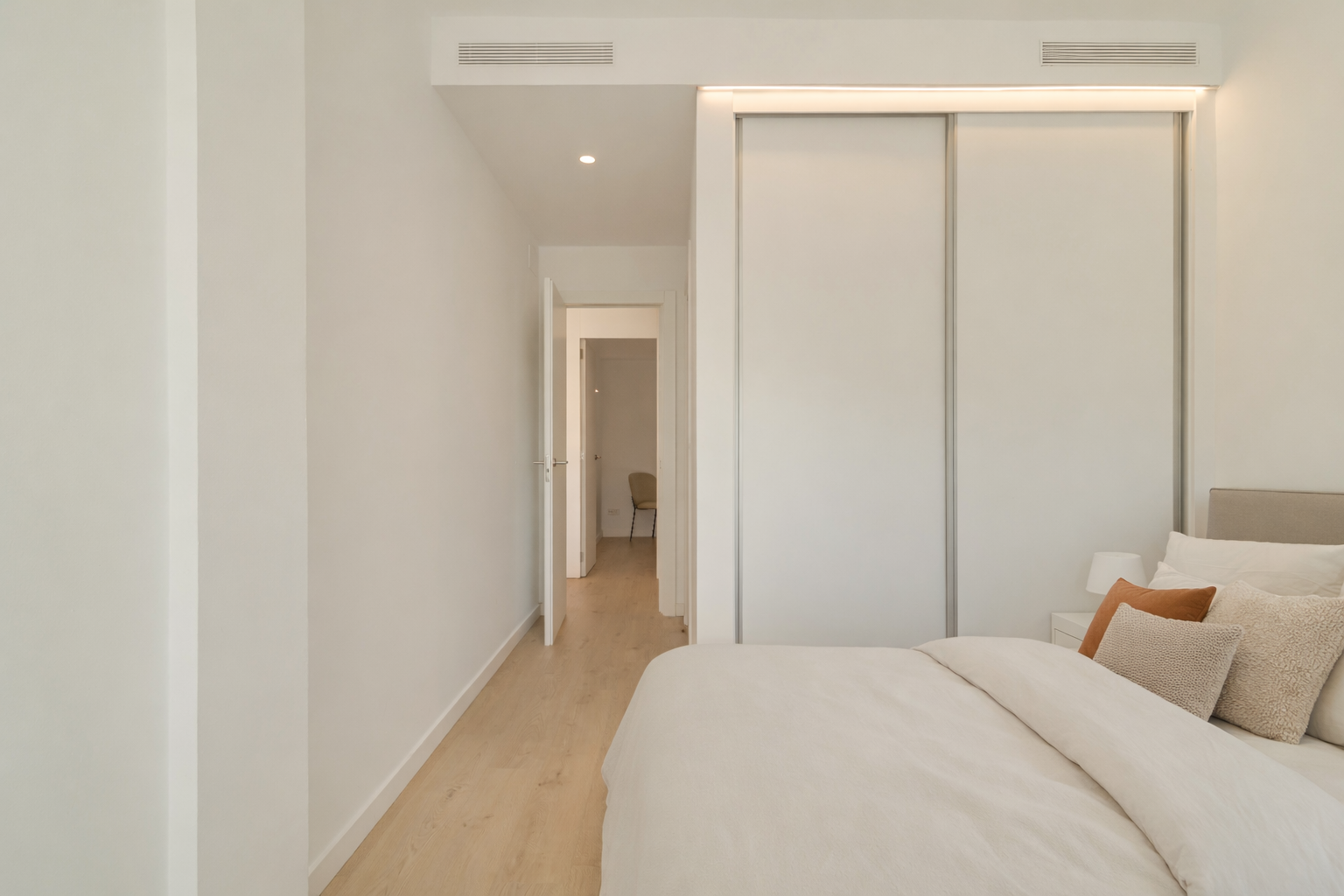 La vivienda cuenta con una distribución muy bien aprovechada, ofreciendo tres habitaciones exteriores: un dormitorio doble en suite con armarios empotrados, un segundo dormitorio doble y una habitación individual. Dispone además otro baño completo de diseño actual con salida a un segundo balcón orientado al patio de luces.